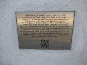Texttafel am Sockel des Schwungrades der ehem. Juteweberei Blancke